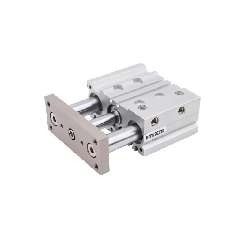 Hered MGPM Series Three Shaft Air Cylinder: Compact guided pneumatic actuators for high precision and load capacity. Features integrated internal guide shafts for enhanced performance and stability. Available in bore sizes 20mm to 100mm. Offers increased bearing length with stroke for high side-load applications. Double-acting with non-lubricated operation for maintenance-free use. Operates at 0.15-1.0MPa pressure and -10°C to 60°C temperature range. Ideal for industrial automation, material handling, medical equipment, and advanced home appliances. Provides rubber bumper cushioning on both ends for reduced wear. Choose Hered MGPM Series for reliable, high-precision pneumatic actuation in space-constrained, high-load environments. Contact Hered Pneumatic for expert guidance on selecting the optimal three-shaft air cylinder for your specific requirements and seamless integration into your precision industrial processes.